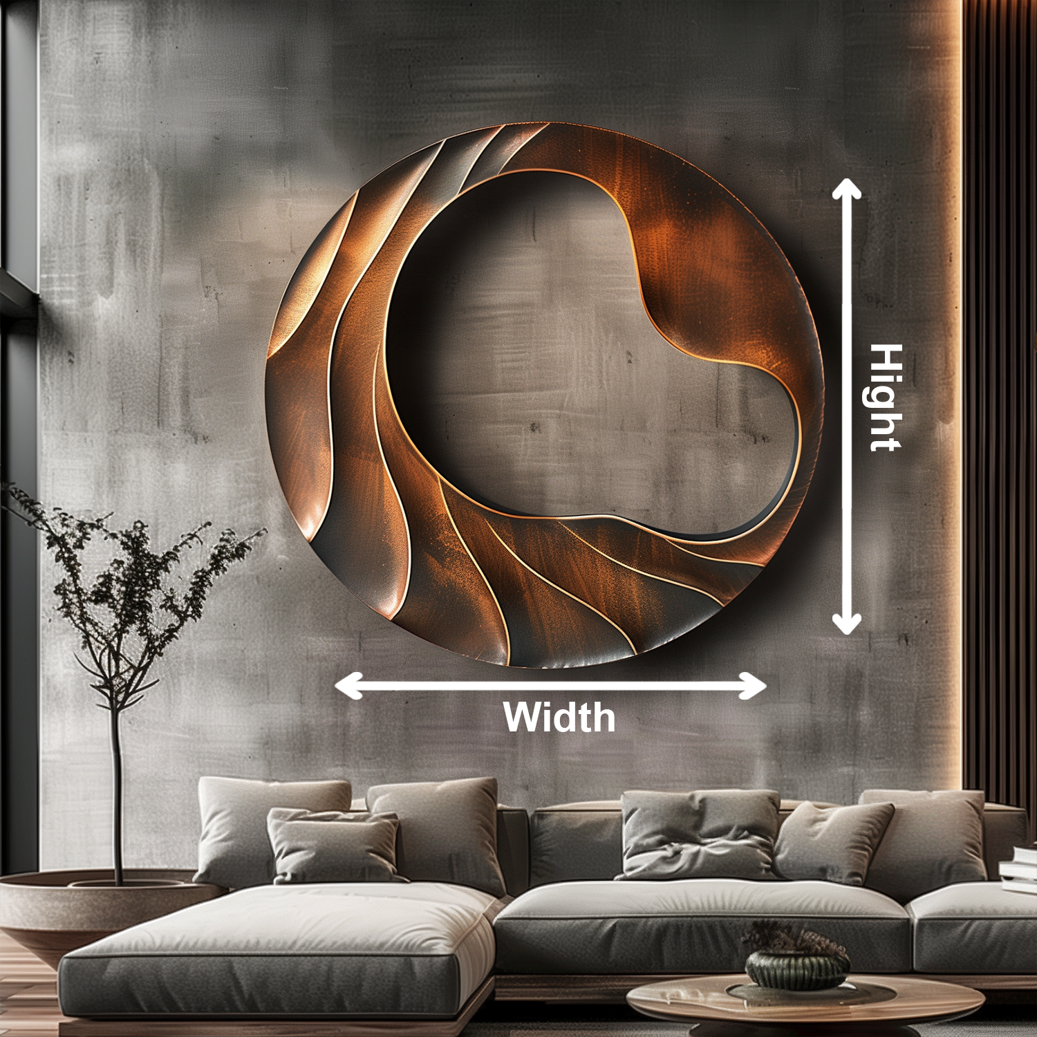 This modern abstract wall sculpture features a striking round form with a flowing heart-shaped center, surrounded by layered copper-like waves that create depth, warmth, and movement.