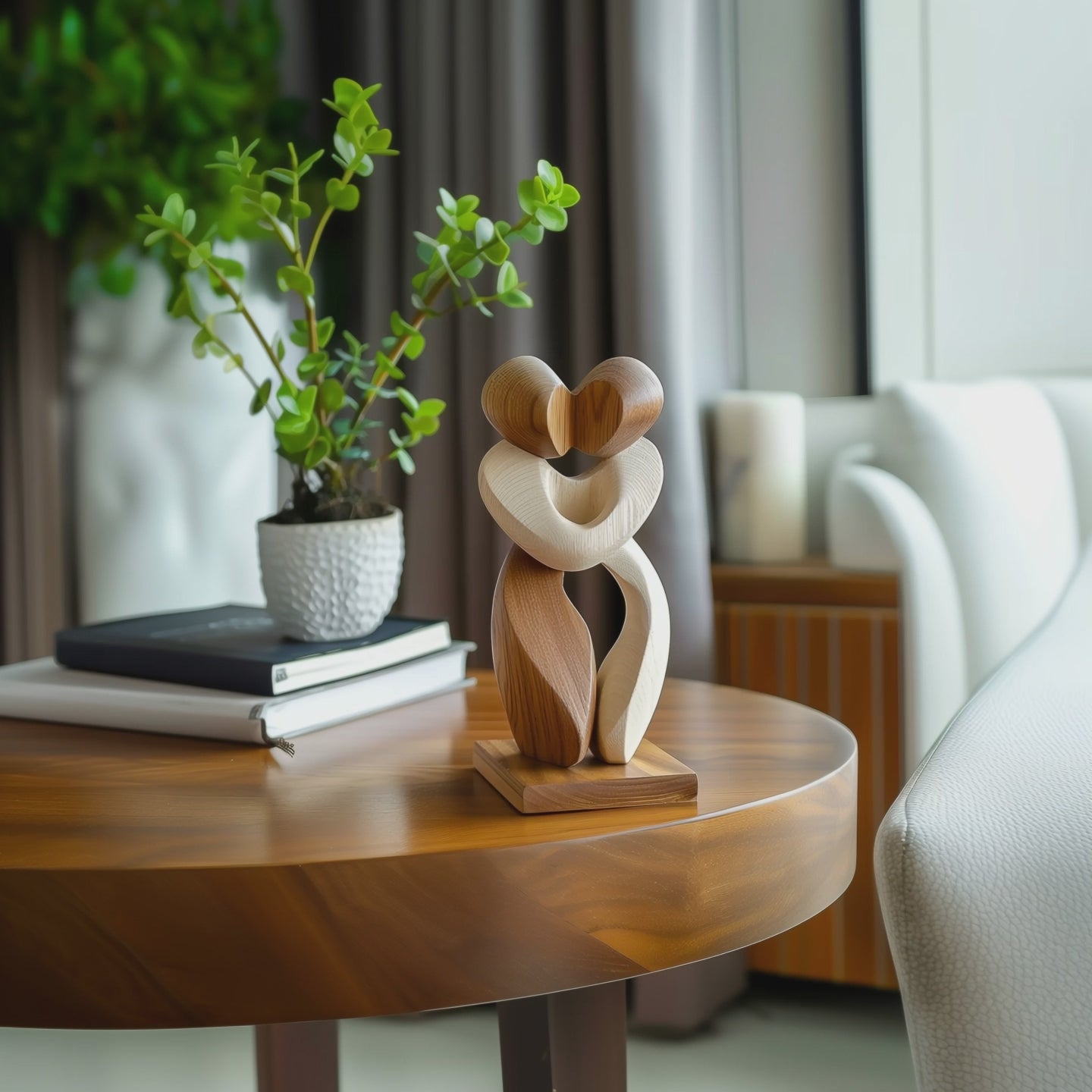 Bring warmth, love, and emotional connection into your space with this handcrafted abstract wooden tabletop sculpture. Designed to symbolize two figures embracing in a gentle heart-shaped form, this piece represents unity, affection, and harmony through soft curves and balanced proportions.