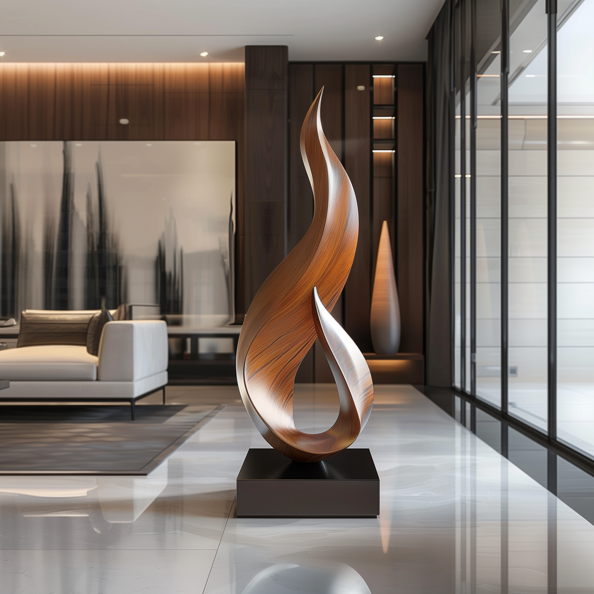 This handcrafted flame-inspired wooden sculpture is a stunning modern art piece that radiates elegance and vitality. With its graceful upward curves and rich natural wood tones, the design captures the essence of a rising flame — symbolizing energy, transformation, and timeless beauty. Mounted on a sleek black base, it makes a powerful statement as a centerpiece for contemporary interiors, adding warmth and sophistication to any space.