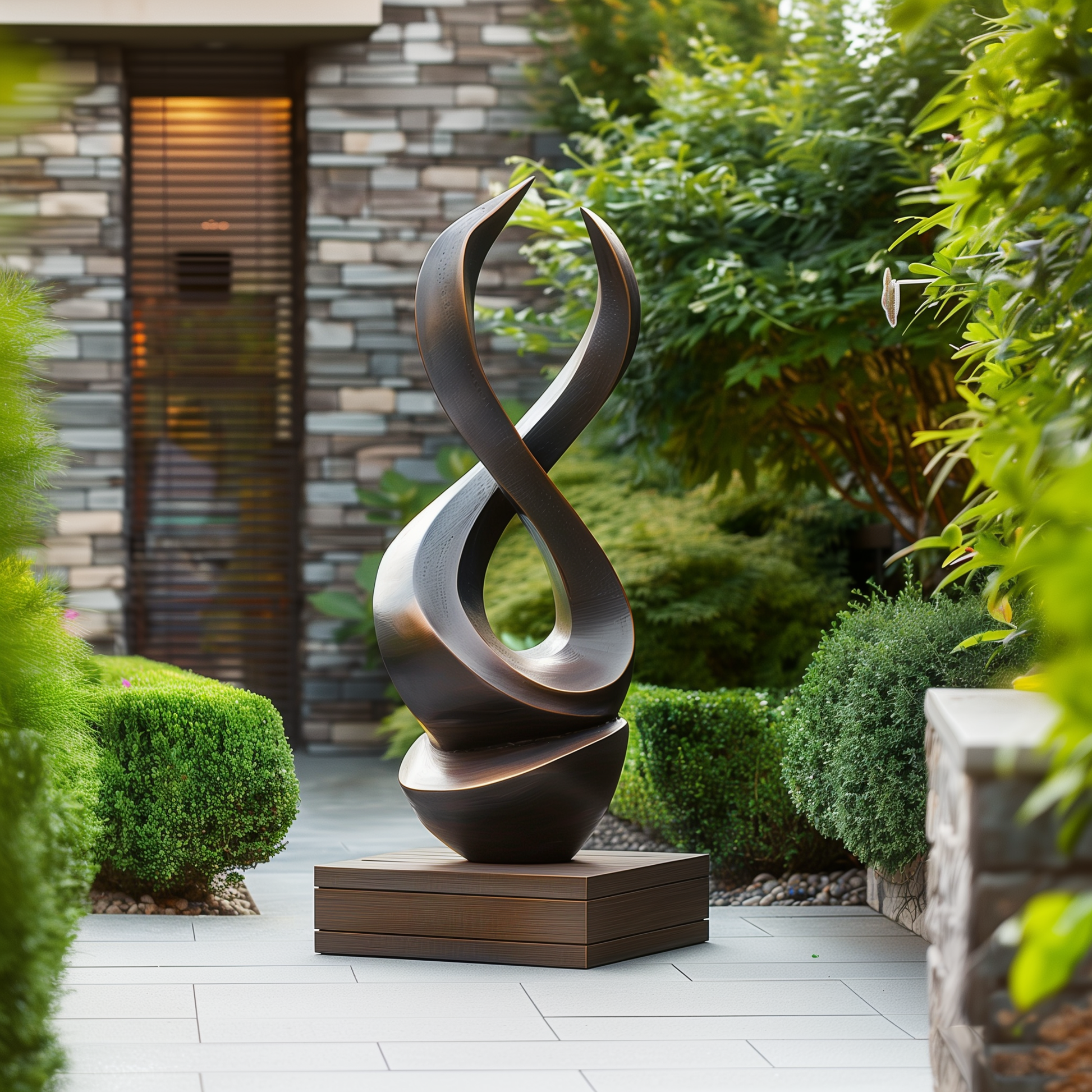 This modern abstract infinity sculpture is a captivating piece of outdoor art designed to elevate gardens, patios, and contemporary living spaces. Handcrafted with a flowing loop silhouette, the design symbolizes eternity, balance, and harmony. Its sleek dark bronze finish enhances the smooth curves, making it a bold statement centerpiece that blends seamlessly with both nature and architecture.