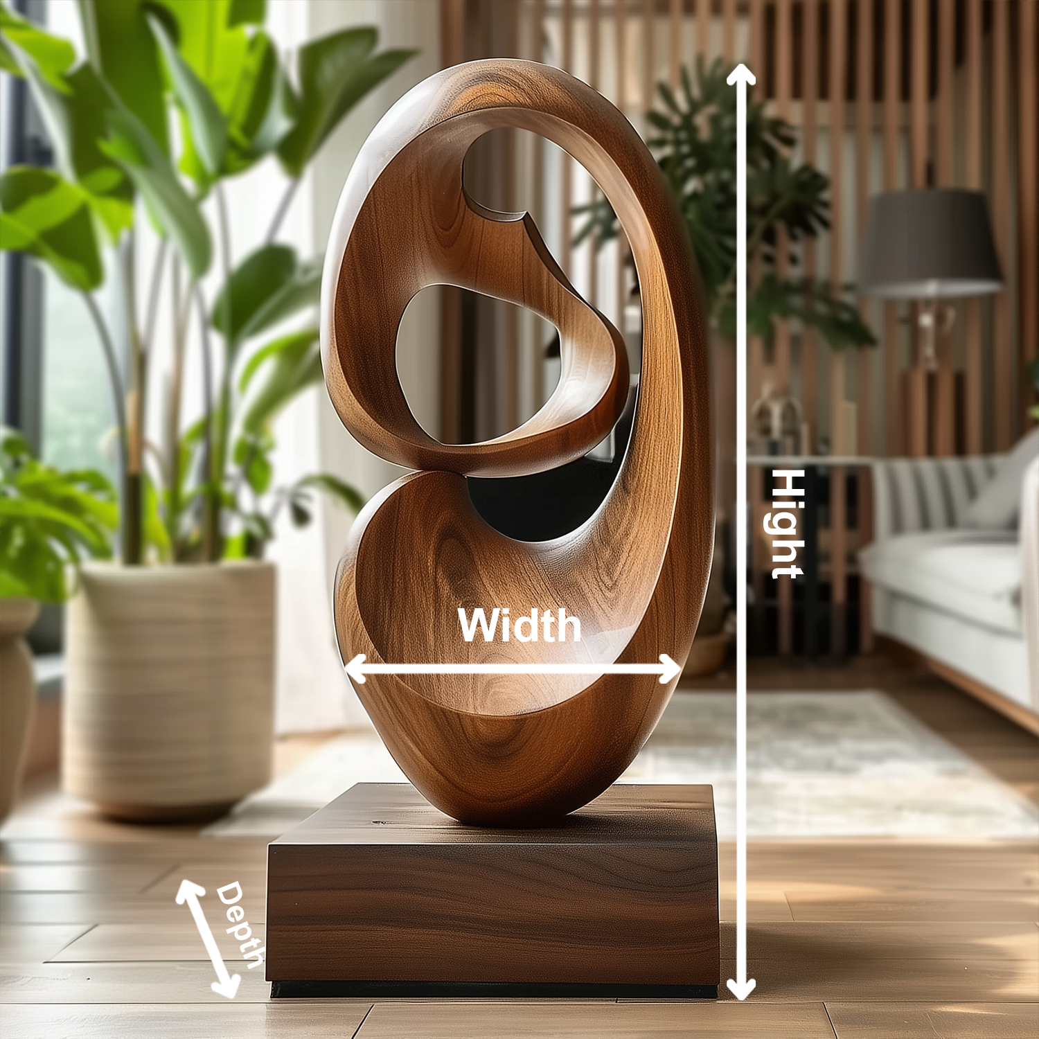This modern abstract wooden sculpture is a stunning work of art that blends elegance, balance, and organic flow. Hand-carved with smooth continuous curves, the design creates an open circular form that symbolizes unity, connection, and harmony. The polished surface highlights the natural beauty of the wood grain, making it an eye-catching centerpiece for contemporary interiors. Mounted on a solid square base, it stands as both a decorative artwork and a meaningful statement piece.
