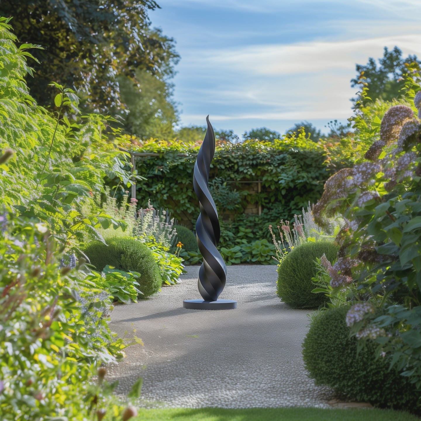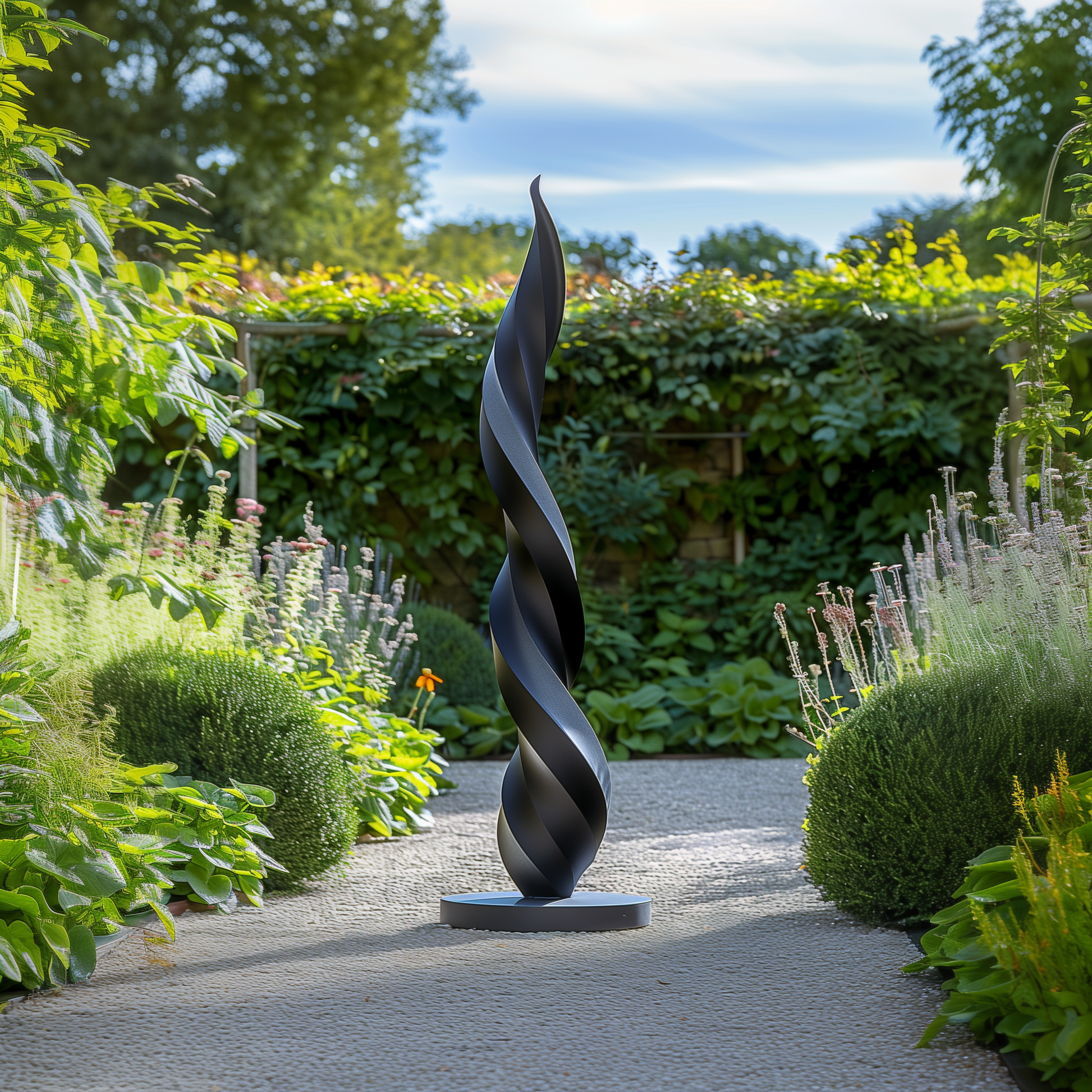 This tall abstract outdoor sculpture is a stunning statement of modern design and elegance. With its sleek twisted flame-like silhouette, the piece symbolizes vitality, transformation, and upward energy. Finished in a deep matte black, it creates a striking contrast against natural greenery, making it an ideal centerpiece for gardens, patios, or landscaped spaces. Handcrafted with precision, the flowing spiral curves bring both movement and sophistication to any setting.