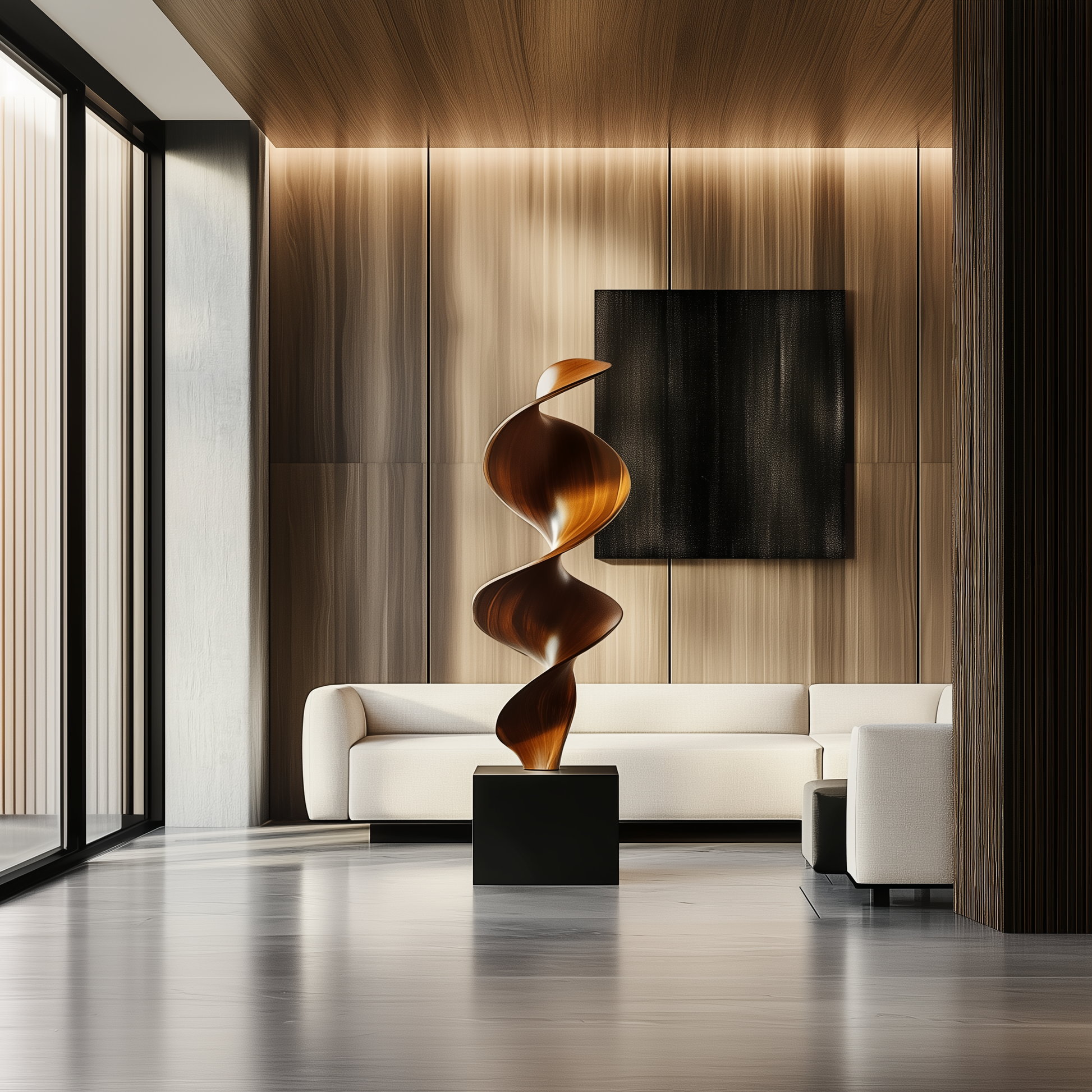 This modern abstract wooden sculpture is a captivating statement piece that embodies movement, balance, and elegance. Hand-carved with a dramatic spiral twist, its flowing curves rise upward in a dance of light and shadow, symbolizing growth and transformation. Perfect as a centerpiece for contemporary living rooms, entryways, or gallery-inspired interiors, this sculpture brings timeless sophistication to any space.